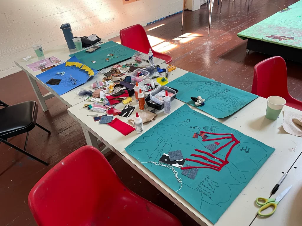 • Offer multiple entry points. Not everyone relates to art-making the same way. In My Fluffy Pajamas workshops combine textile work, mapmaking, drawing, and storytelling. Participants can engage with one or all. Some people work better with structured prompts. Others need open-ended exploration. Offer both.
