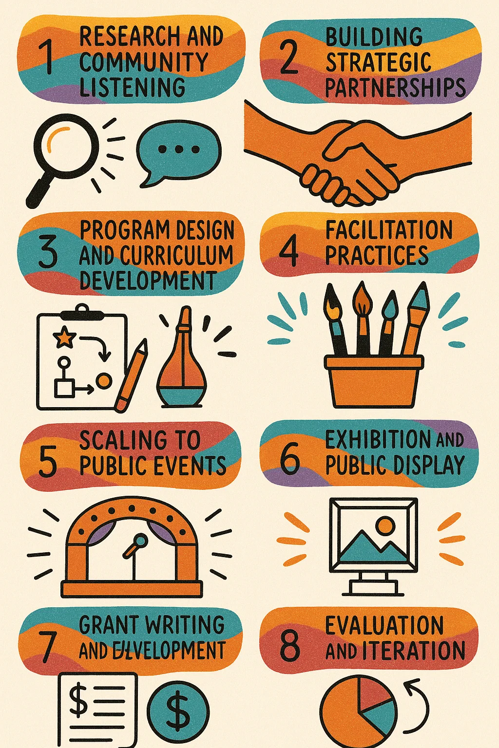 Through this research, you’ll start seeing where needs aren’t being met. In our case, we found that while many programs served immigrant communities, few combined trauma-informed approaches with culturally specific arts practices. Few offered multilingual facilitation. Few centered stories of displacement and resilience in ways that honored complexity rather than reducing experiences to simple narratives.